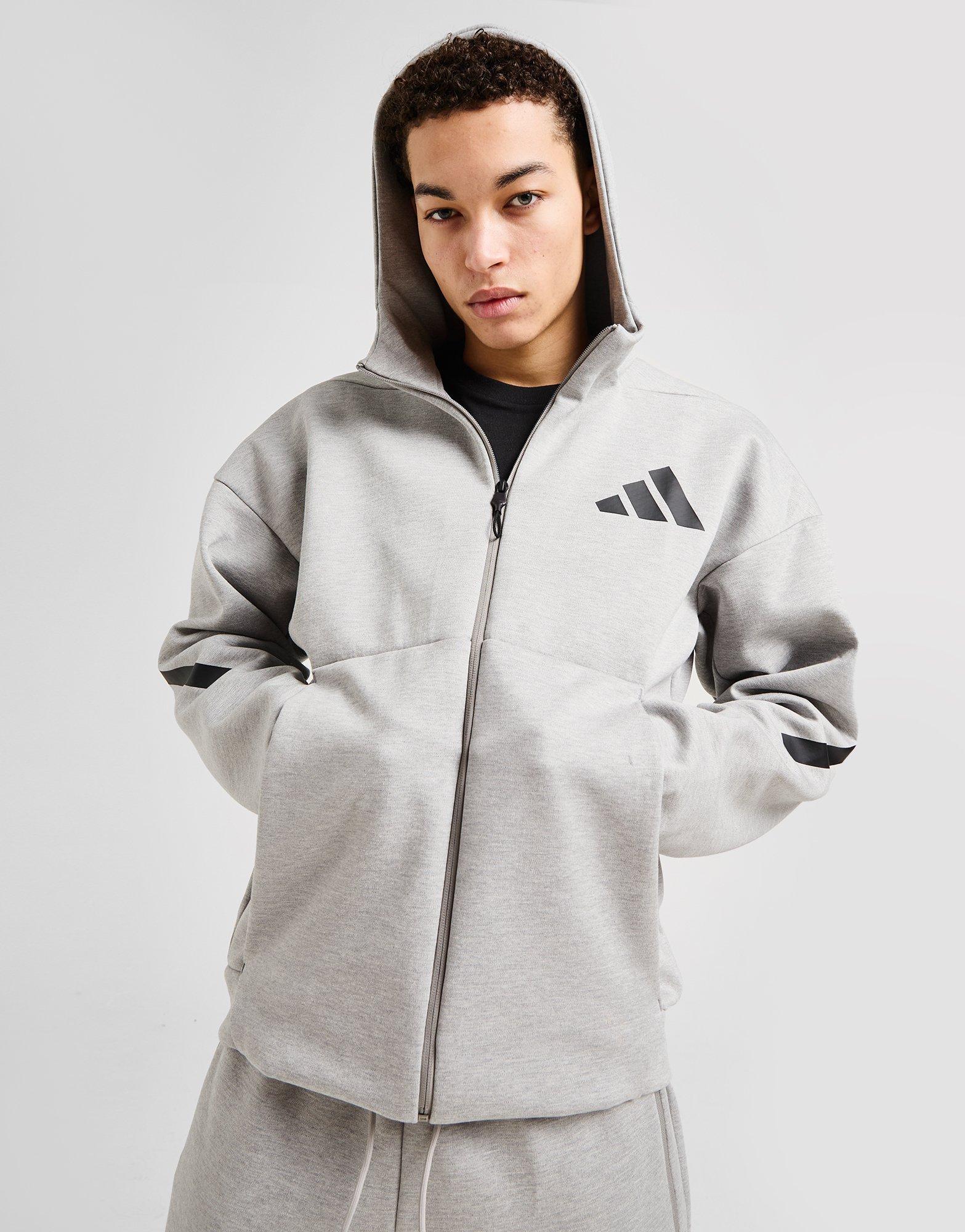 Layer up in sports-inspired style with this men's Z.N.E Hoodie from adidas. In a Medium Grey Heather colourway, this standard fit hoodie is cut from soft fleece fabric that partly uses recycled polyester. It features a hood and full-zip fastening for custom coverage, with elasticated trims to hold the shape and zip-up side pockets for safe storage. Finished up with the Performance logo stamped to the chest. Machine washable | Our model is 6'2" with a 38" chest and wears a size M. | JF2450